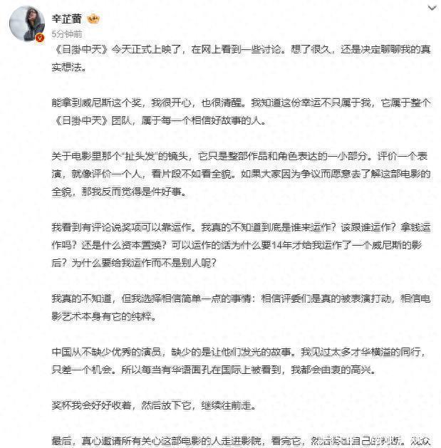 能拿到威尼斯这个奖,我很开心,也很清醒。我知道这份幸运不只属于我,它属于整个《日掛中天》团队,属于每一个相信好故事的人。